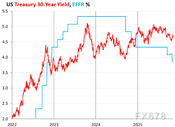 30年期美债收益率升至4.70%,美联储10月降息前为4.55%,2024年9月降息前则为3.94%,美联储当前已累计降息150个基点,而同期30年期美债收益率逆势上行76个基点。