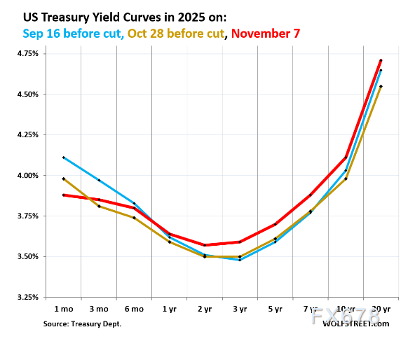 自上次降息以来,收益率曲线整体上行,下图展示了2025年三个关键时间节点的全期限美债收益率曲线(1个月期至30年期):
