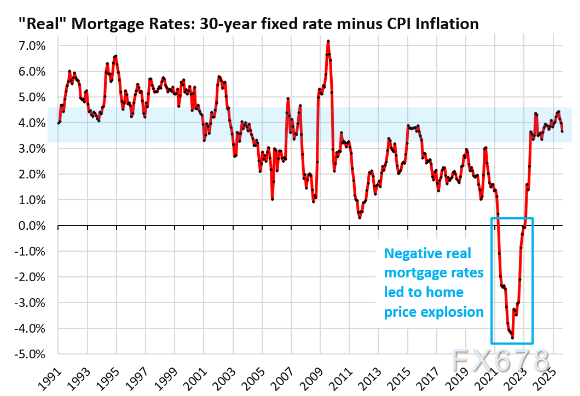 此次房价暴涨本质是美联储激进货币政策的产物:当时通胀已开始蔓延并一度逼近9%,美联储却将30年期固定按揭利率人为压低至3%以下,形成-3%、-4%甚至更低的负实际按揭利率——这一近乎“免费资金”的环境,导致购房者理性决策失效、价格敏感度大幅下降,而这一非理性繁荣终难持续。
